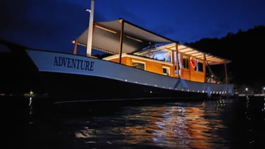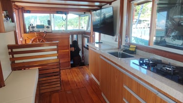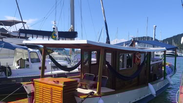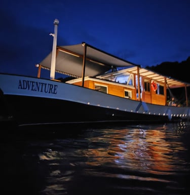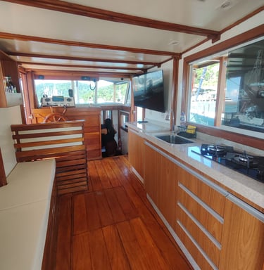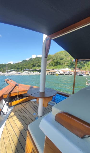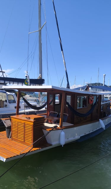 O Adventure é o reflexo da visão de seus proprietários: unir a alma da construção artesanal à eficiência da tecnologia de ponta. Cada detalhe em madeira celebra a tradição náutica e o acolhimento do rústico, enquanto nossos sistemas garantem uma navegação moderna e segura.